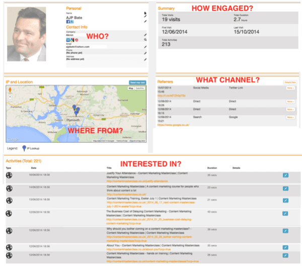I was able to monitor and measure the efficacy of my posts, tweets and emails in Google Analytics, MailChimp and SocialShare, but I also wanted to identify my warmest prospects and see their engagement and interest, once they arrived on my website.